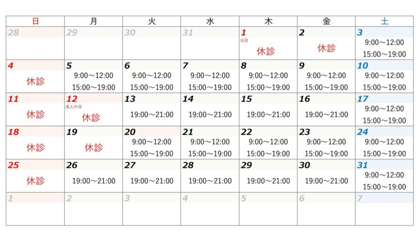 19:00 ~ 21:00 | ▢ | ▢ | ▢ | ▢ | ▢ | ー | ー |